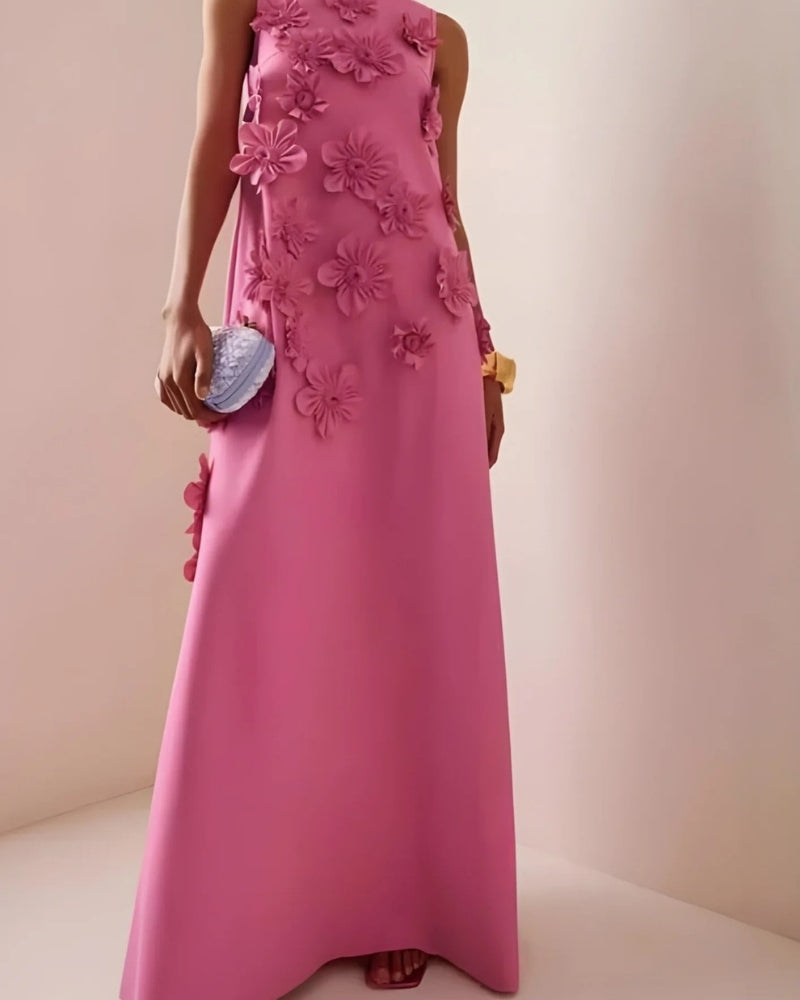 This women’s maxi dress features a sleeveless design with a high neckline and a softly flowing, floor-length cut. Floral appliqué details are applied across the surface to add subtle texture and visual interest, while the smooth overall shape maintains a composed appearance. With a balanced drape, the dress integrates into formal and occasion-focused wardrobes.
